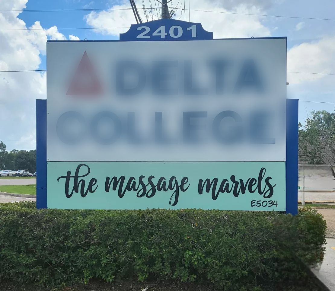 Located on the first floor of the 2 story Delta College Building "C". We are not students and not affiliated with the school. We are licensed, professional massage therapists who rent a room in the building.